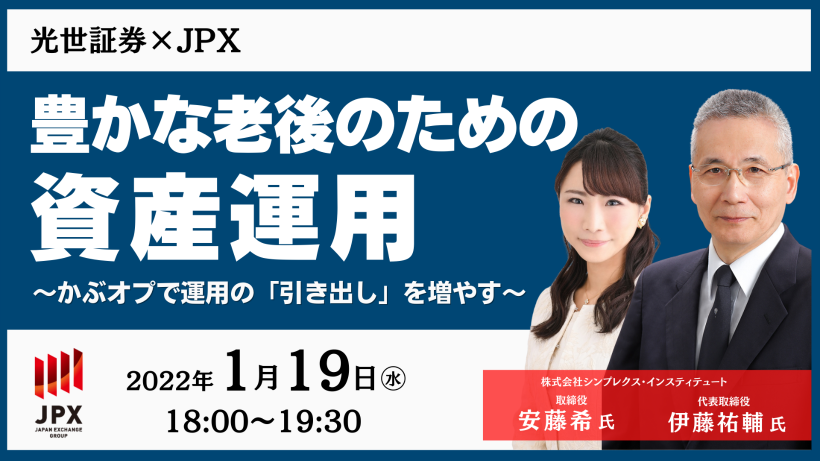 日本取引所グループ(JPX)大阪取引所が主催でお届けするリアルタイムWebinarです。講師にシンプレクス・インスティテュート代表取締役伊藤祐輔氏と取締役安藤希氏を迎え、資産運用やかぶオプを使った投資術について解説するセミナーです。今後の資産運用について考えている方、投資の「引き出し」を増やしたい方にもお勧めです。