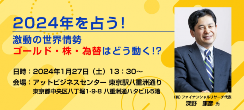 | 【講演】 | 「2024年を占う(激動の世界情勢!!ゴールド・株・為替はどう動く!?)」 |
