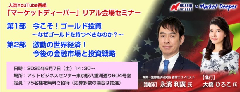 人気YouTube番組「マーケットディーパー」のリアル会場セミナー!今回は永濱利廣氏を講師にお迎えし、今後の金融市場の動向と投資戦略についてお話しいただきます。また、第1部ではゴールド投資についてお話しいたします。