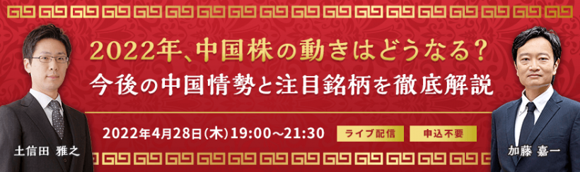 | 【講演】 | 「2022年、中国株の動きはどうなる?今後の中国情勢と注目銘柄を徹底解説」 |