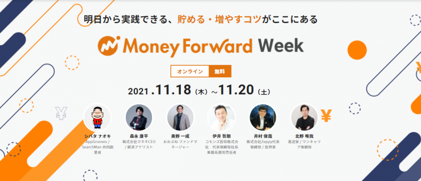 イベント WEBセミナー マネーフォワード主催「マネーフォワード Week 2021」 11月18日|木| 詳細はWEBにて 【講演】 「マネーフォワード Week 2021」 【日程】 11月18日(木) ~11月20日(土) 【時間】 詳細はWEBにて 【会場】 [ WEB ] WEB 【料金】 無料