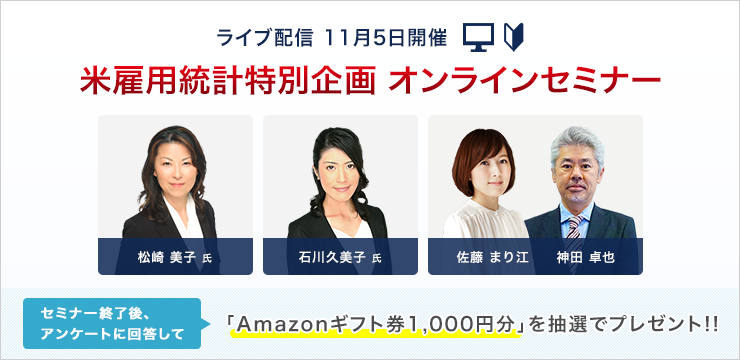 外為どっとコムでは、為替業界のみならず全てのマーケット関係者が注目する経済指標「米国雇用統計」を解説する無料オンラインセミナーを配信いたします。当日は、21時30分の「米雇用統計」発表の30分前からライブ配信を開始。今回は、ロンドン在住の元外銀ディーラー松崎美子氏と為替アナリストの石川久美子氏がゲストで登場します。