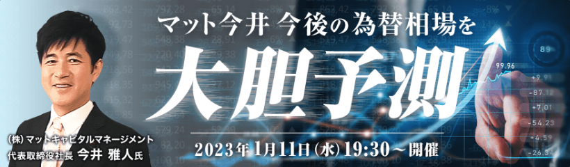 FX・為替 WEBセミナー 楽天証券主催「マット今井 今後の為替相場を大胆予測!」 1月11日|水| 19:30-21:00 【講演】 「マット今井 今後の為替相場を大胆予測!」 【講師】 今井 雅人 【日程】 1月11日(水) 【時間】 19:30-21:00 【会場】 [ WEB ] WEB(YouTube) 【料金】 無料