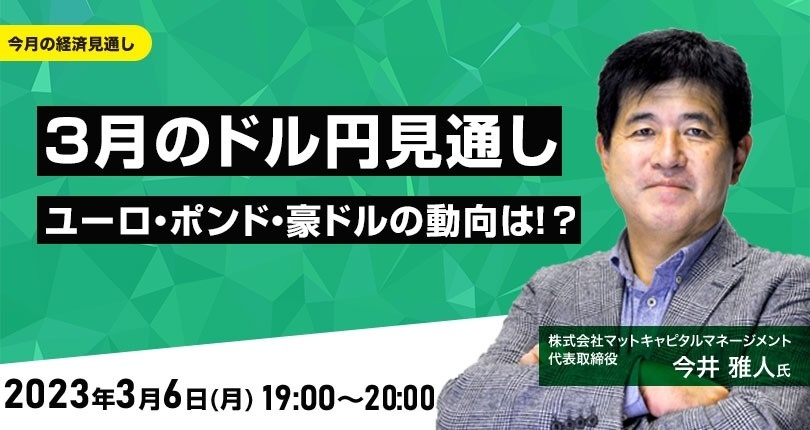 FX・為替 WEBセミナー 外為どっとコム主催「3月のドル/円見通し ユーロ、ポンド、豪ドルの動向は!?」 3月06日|月| 19:00-20:00 銀行ディーラー時代の輝かしい実績を持つ「マット今井」こと今井雅人氏による恒例の経済・為替相場の解説セミナーです。各通貨の具体的な展開を今井節で明快に解説します。 【講演】 「3月のドル/円見通し ユーロ、ポンド、豪ドルの動向は!?」 【講師】 今井 雅人 【日程】 3月06日(月) 【時間】 19:00-20:00 【会場】 [ WEB ] WEB 【料金】 無料