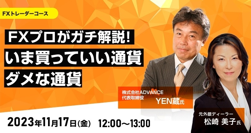 元外銀ディーラーで、現在は個人投資家として幅広く活躍中のYEN蔵氏と松崎美子氏が揃って登壇!FXの世界で長年に渡り実績を積み上げて来たお二人が「いま買っていい通貨、ダメな通貨」という視点で解説します。また、少し気が早いですが、2023年のFXトレードの成果・状況も伺う予定です。今後のFX投資のヒントを得られるチャンスですので、是非ご参加ください。