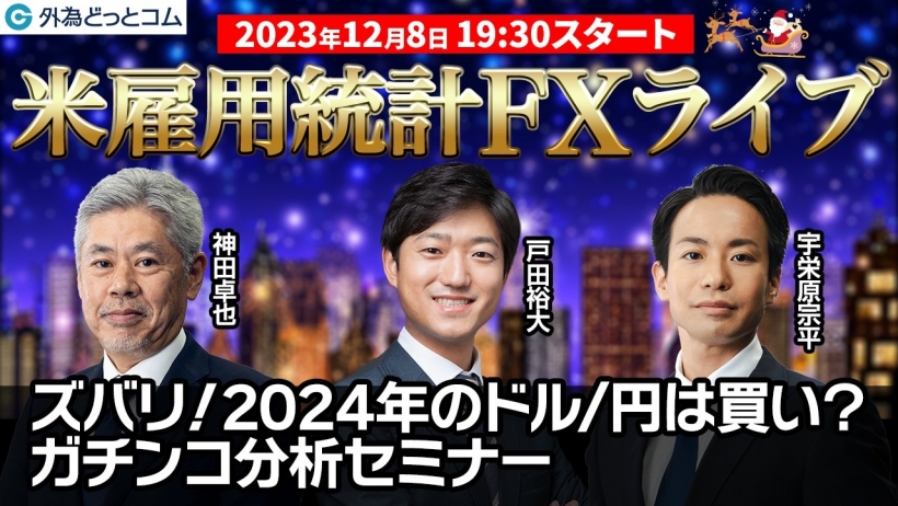 19時30分~21時00分まではゲストの戸田裕大氏、また外為どっとコム総研の神田調査部長、宇栄原研究員と一緒に米雇用統計発表後のマーケットの反応や売買戦略を予想しましょう。また、今月のドル/円相場の見通しだけではなく、2024年はどう予想しているのかなどもディスカッションする予定です。