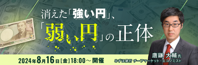 FX・為替 WEBセミナー 楽天証券主催「WEBセミナー:消えた強い円、弱い円の正体」 8月16日|金| 18:00-19:00 日米金利差だけに依存した円相場見通しがなぜ報われなくなっているのか? 国際収支分析の観点から現在の円安の正体とこれからの円相場を見るためのポイントを挙げていきます。 【講演】 「消えた強い円、弱い円の正体」 【講師】 唐鎌 大輔 【日程】 8月16日(金) 【時間】 18:00-19:00 【会場】 [ WEB ] WEB 【料金】 無料