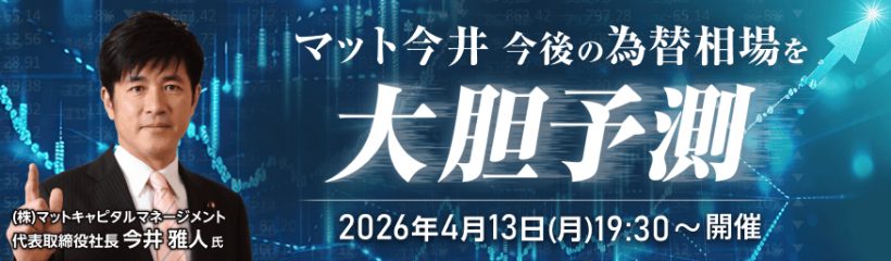 “マット今井”こと今井雅人氏が、今後の為替相場の見通しを大胆予測するオンラインセミナーを開催!為替相場の背景にある経済・政治・社会情勢、そして今井雅人氏の長年の経験と独自の視点から「相場の読み解き方」を徹底解説いたします。セミナー開催中は、YouTubeのチャット機能を利用して今井雅人氏にリアルタイムで質問ができます!