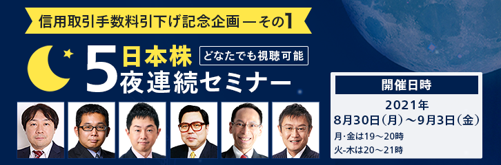 | 【講演】 | 「手数料引下げ記念:日本株5夜連続セミナー」 |