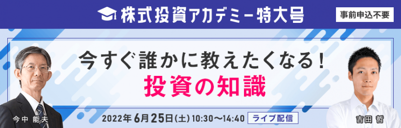 ライブ配信にて、株式投資アカデミーを開催いたします!今回は5名の講師が登壇する特大号です!YouTubeを使ったライブ配信なので、YouTubeのチャット機能を利用してリアルタイムで講師に質問できます!ぜひこの機会に講師に質問してみてくださいね。