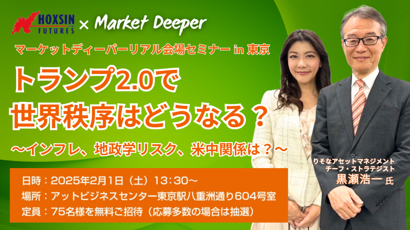 りそなアセットマネジメント(株)運用戦略部チーフ・ストラテジストの黒瀬浩一氏が、トランプ2.0が世界経済やインフレ動向へ与える影響、米中関係などが金や白金・原油をはじめとするコモディティ相場へどのような影響を与えるかお話しいたします。