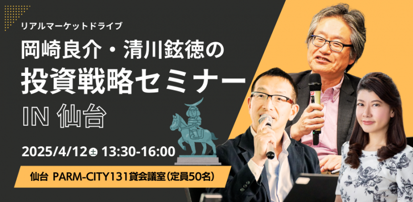 金融ストラテジストの岡崎良介氏と元ファンドマネージャーで株式分析に定評のある清川鉉徳氏による特別セミナー、初の仙台で開催! 前回11/2に軽井沢で開催したセミナーから4ヶ月、二人の投資戦略はどう変化したのか?少人数制のセミナーでじっくりと語ります。質問タイムもたっぷりと。ぜひ、仙台でお会いいたしましょう。